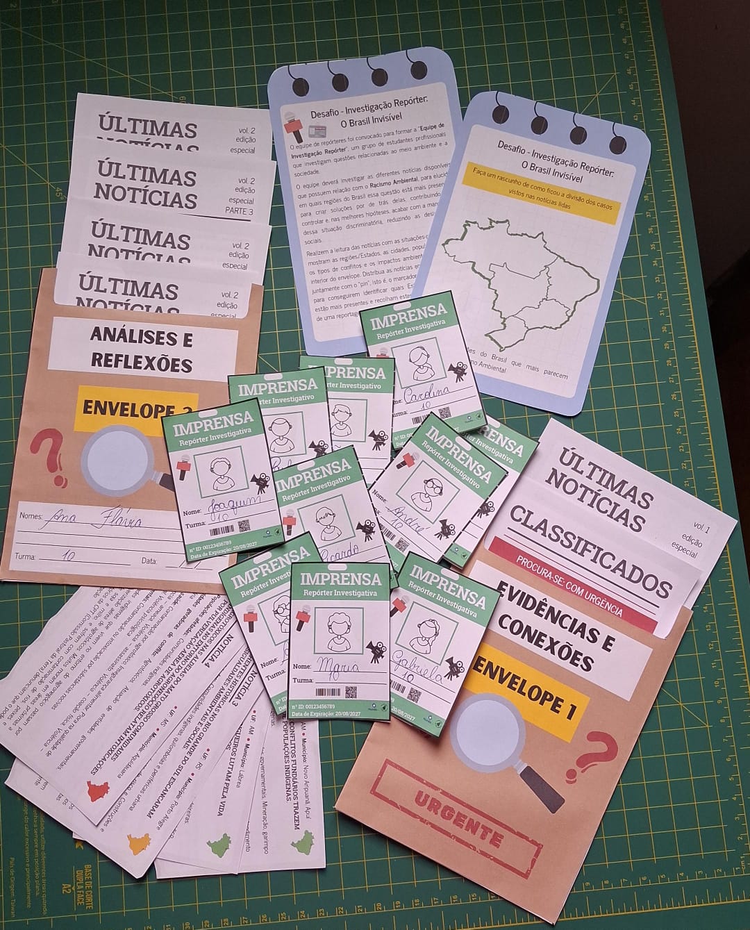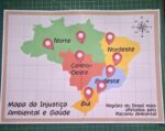 O material em PDF com 50 páginas é uma proposta didática que visa promover a discussão sobre justiça ambiental e desigualdades socioambientais em contextos escolares. O recurso inclui um roteiro de atividade investigativa em formato de jogo, no qual os estudantes assumem o papel de repórteres para investigar casos de racismo ambiental ocorridos no Brasil. O material contém instruções detalhadas para o professor, moldes para montagem de tabuleiro, crachás, envelopes e fichas com notícias reais adaptadas sobre desmatamento, agrotóxicos, mineração, enchentes e desertificação, e opçoes preto e branca ou colorida.